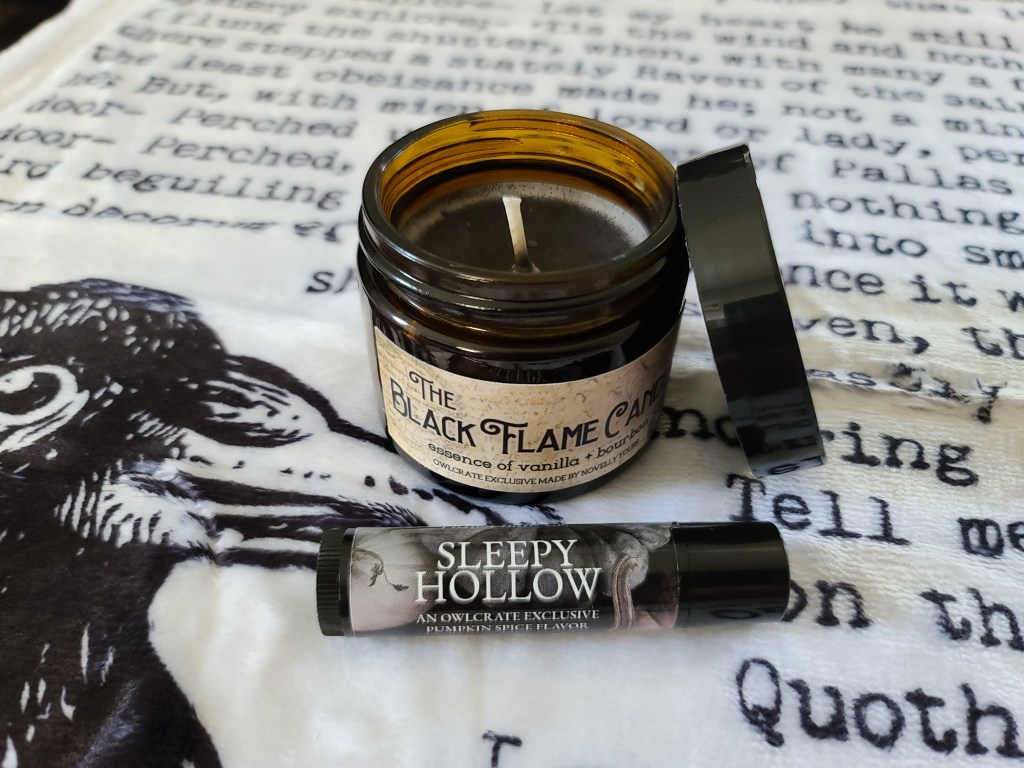 One of my favorite things to get, in a subscription box or otherwise, are candles! The Black Flame Candle smells quite nice – bourbon and vanilla. The Sleepy Hollow lip balm is pumpkin spice scented, though it’s not a strong scent at all.