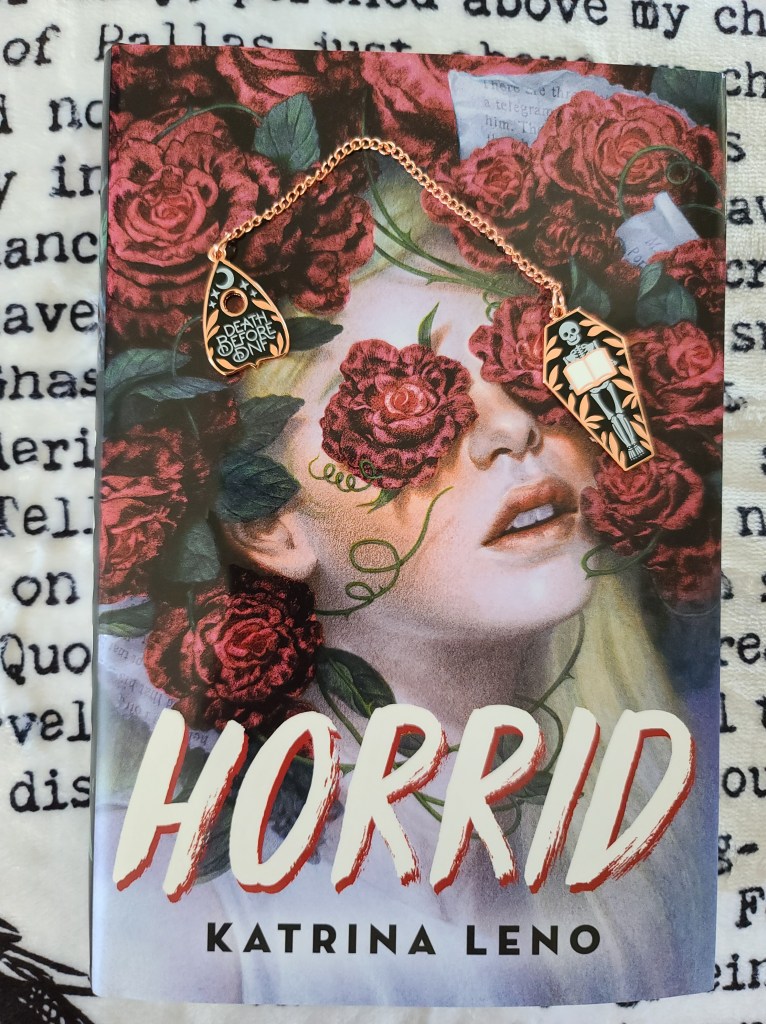 First up, we have the book feature for the month, which is Horrid by Katrina Leno. This is a spooky tale set in an old house in Maine with lots of family secrets. Also in the picture above is this cool chain and pendant bookmark that says “Death before DNF”.