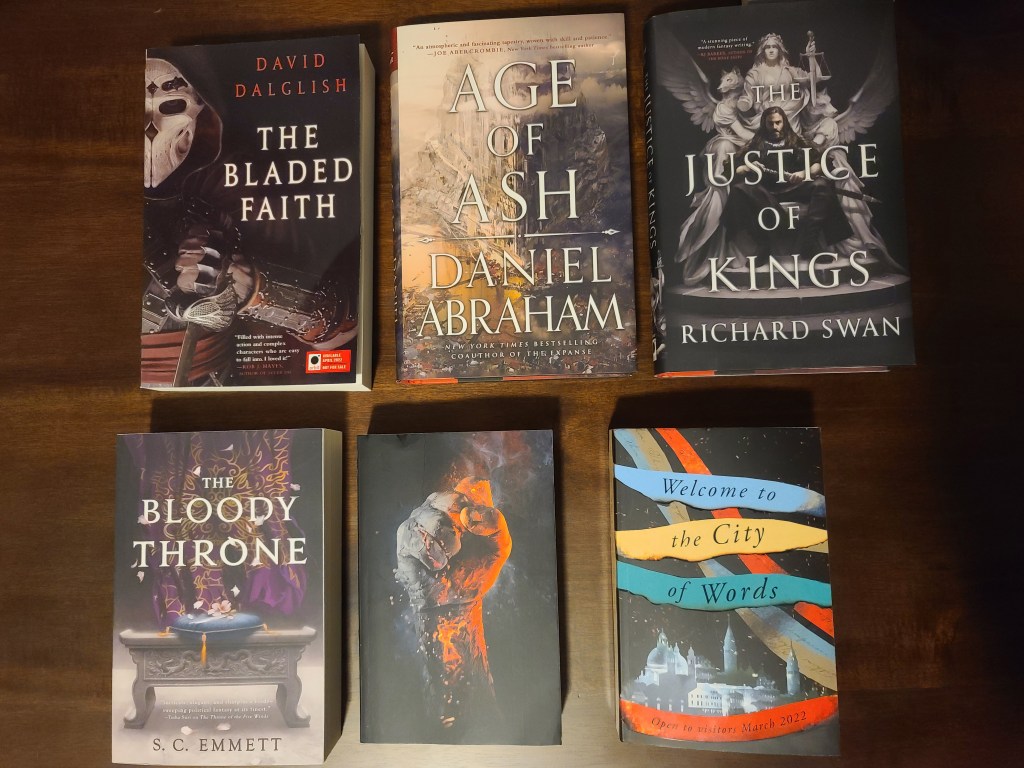Many thanks to Orbit for the finished copies of Age of Ash, The Justice of Kings, and The Bloody Throne and for the exciting ARC of The Bladed Faith by David Dalglish!