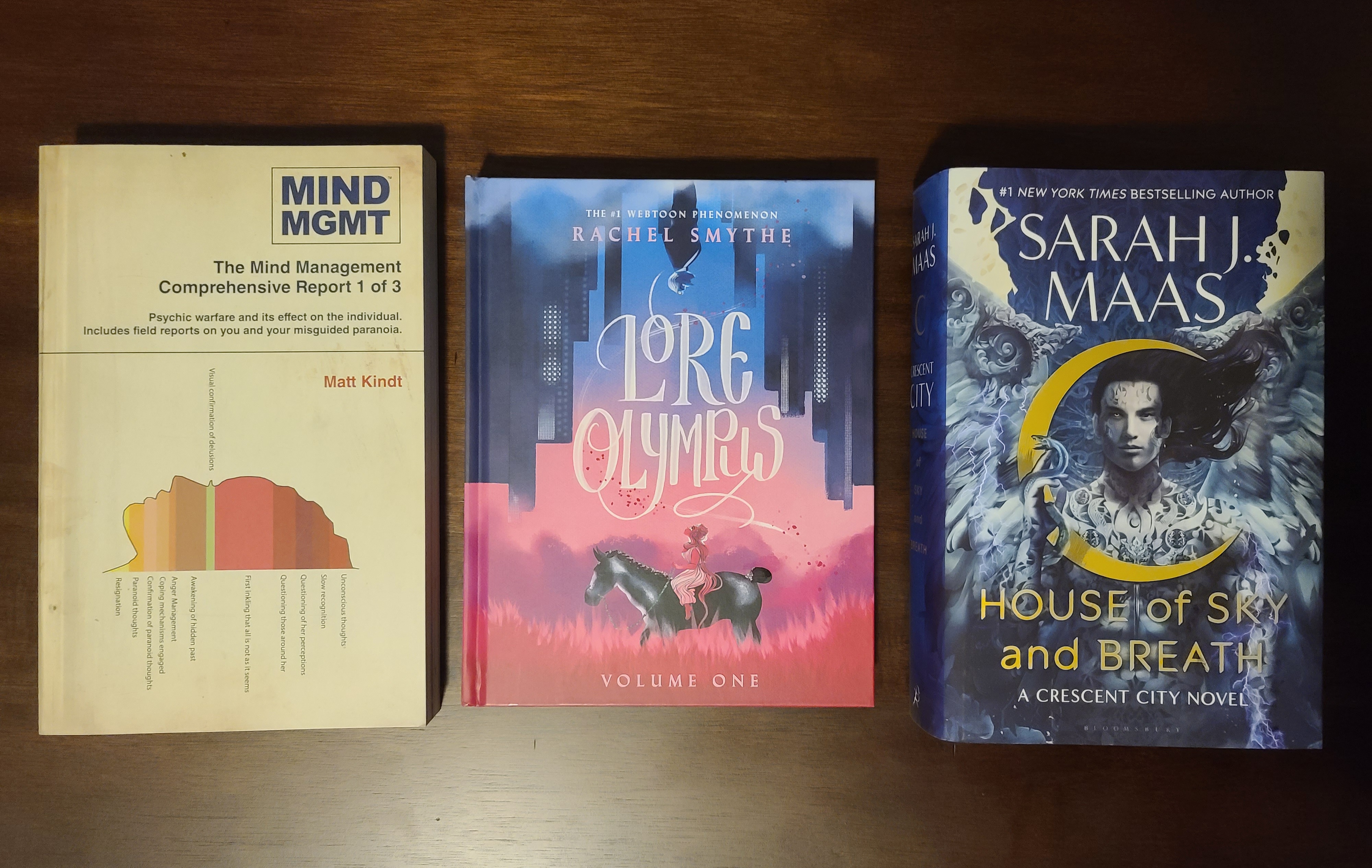 Little change of pace for me – I picked up a couple graphic novels! I’ve heard tons of praise for Lore Olympus and I may have been binging the Webtoons version for the last week after finishing Volume One. MIND MGMT was a recommendation from a friend (apparently there’s a board game??) and it sounded pretty awesome. And obviously, who would I be if I didn’t immediately buy House of Sky and Breath immediately?