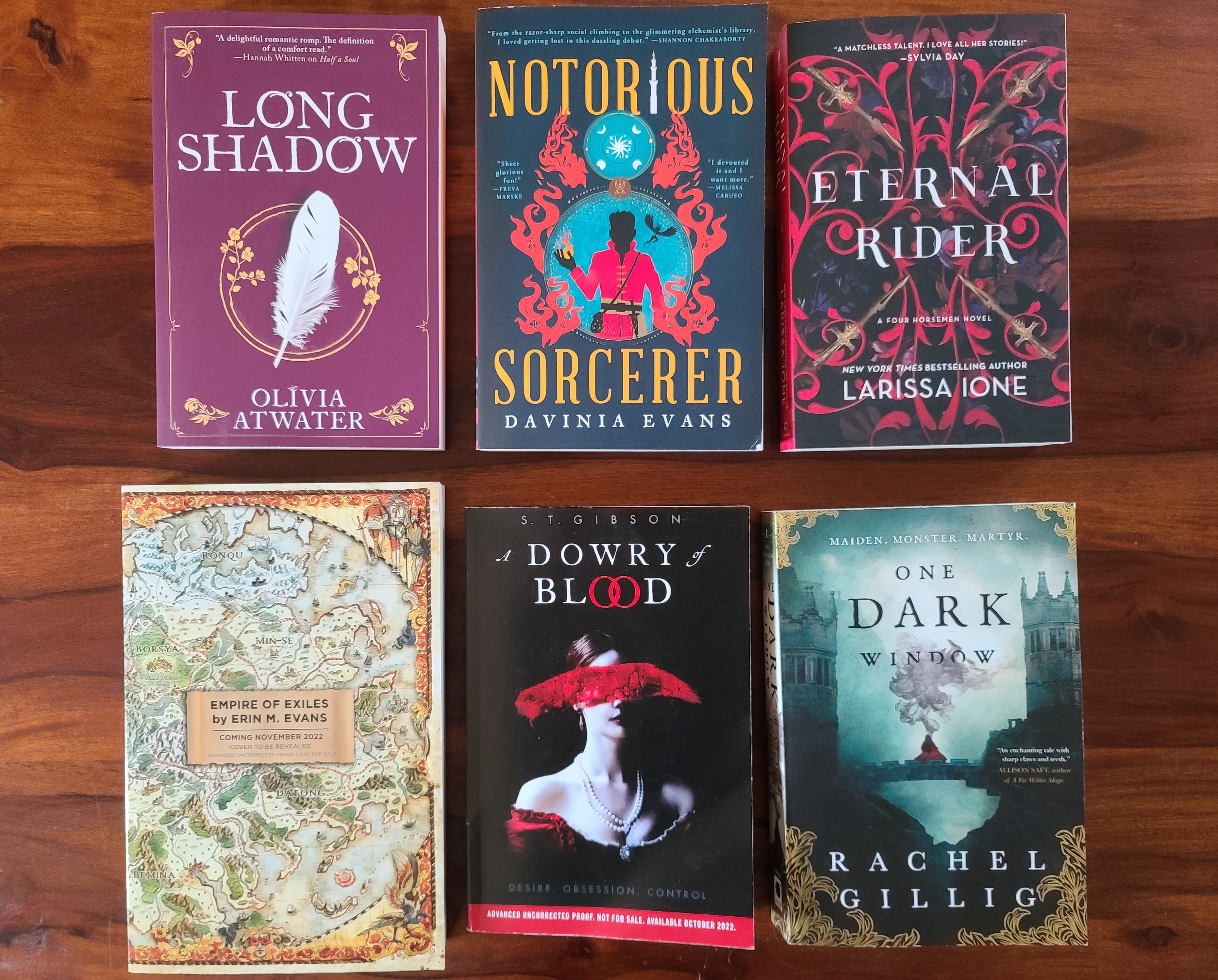 Since my last Stacking the Shelves update I’ve received several very exciting new books! I received finished copies of Longshadow, Notorious Sorcerer, One Dark Window, and Eternal Rider (which is from Forever, a sister publisher of Orbit). I also received two very exciting ARCs – Empire of Exiles by Erin M. Evans and A Dowry of Blood by S.T. Gibson (review coming soon!).