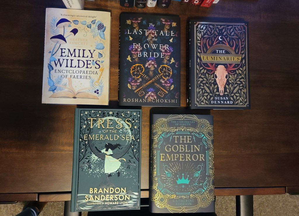 My subscription box purchases have been rolling in steadily over the last month with more on the way soon! Emily Wilde’s Encyclopaedia of Faeries and The Last Tale of the Flower Bride were from Fairyloot’s December and January boxes, respectively. The Luminaries by Susan Dennnard is from my long awaited and delayed November Illumicrate box. Tress of the Emerald Sea by Brandon Sanderson arrived just two days ago and I am absolutely thrilled with the quality and production of this book! Last but not least, The Goblin Emperor by Katherine Addison was from The Broken Binding’s December box.