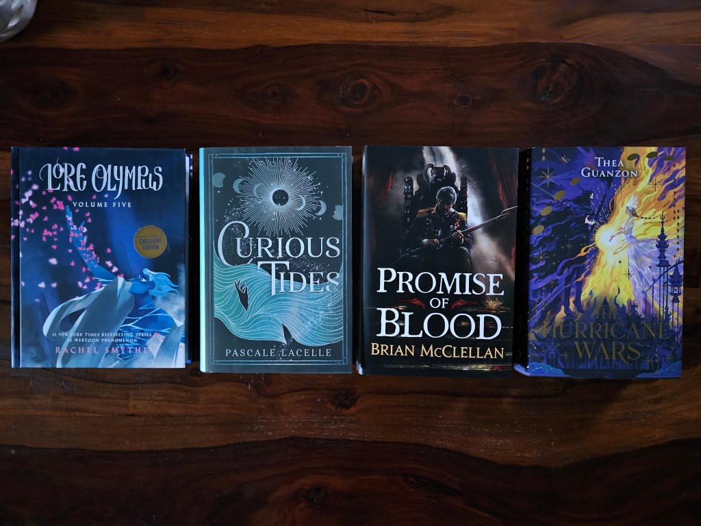I finally have some new subscription box books to show off after skipping some boxes recently! First off, I had my pre-orders of Lore Olympus Vol 5 and Curious Tides arrive. Next, The Broken Binding is doing special editions of one of my absolute favorite fantasy series of all time, starting with Promise of Blood! The Fairyloot October box also arrived, containing this stunning edition of The Hurricane Wars by Thea Guanzon.