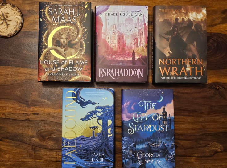 A pretty reasonable haul for the last month! I had pre-ordered House of Flame and Shadow, which finally arrived several days after the release date (good thing I got the audiobook). I also finally received my hardcover copy of Esrahaddon, which very excitingly has a quote from my review of Farilane on the back!! Next up we have Northern Wrath by Thilde Kold Holdt, which was the January book from The Broken Binding. And lastly, the beautiful December and January book picks from FairyLoot – Faebound by Saara el-Arifi and The City of Stardust by Georgia Summers.