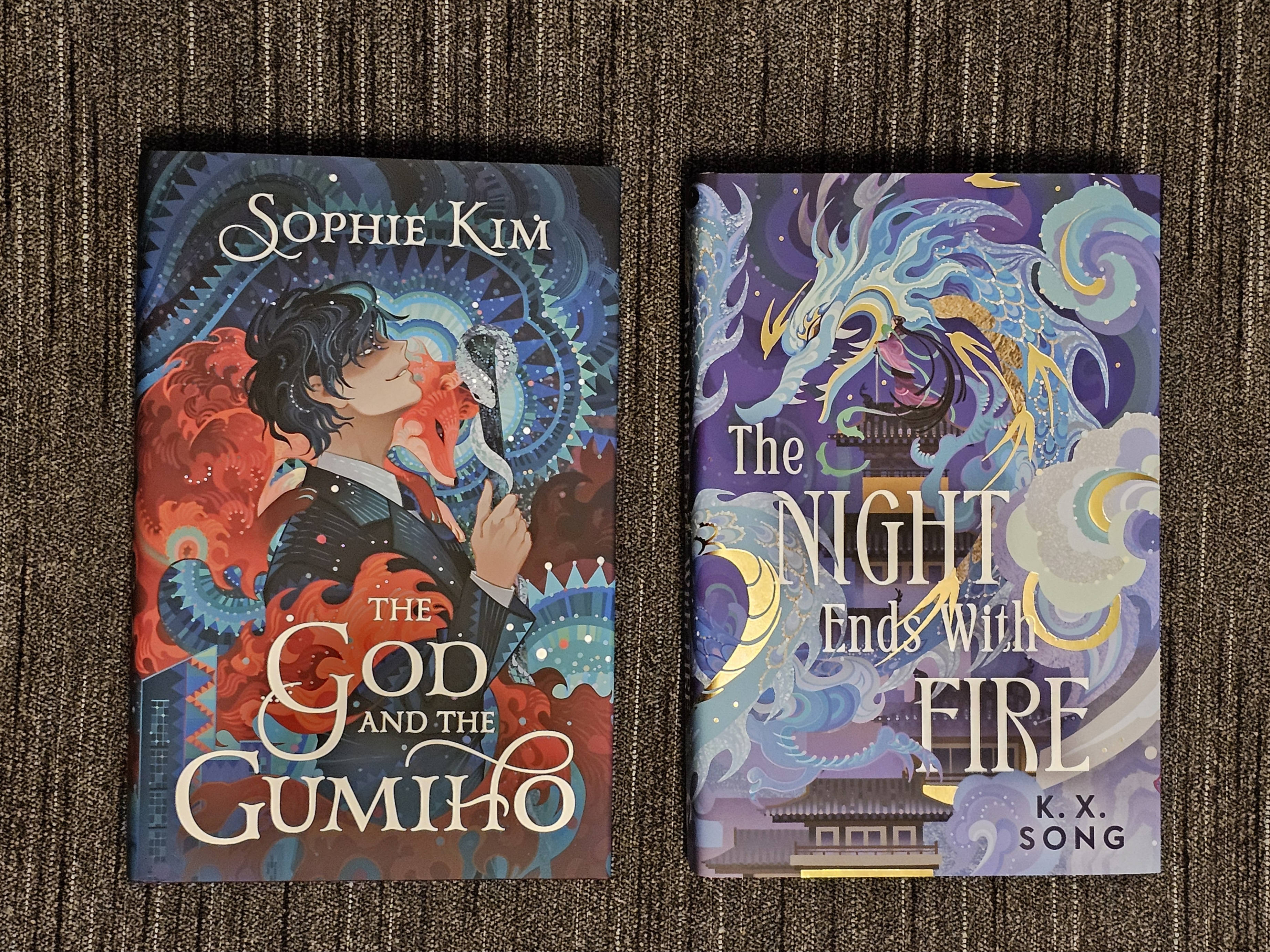 I have two lovely FairyLoot editions to show of this month! First is the June book, The God and the Gumiho by Sophie Kim and then the July book, which is The Night Ends with Fire by K.X. Song. Both are gorgeous and have digitally sprayed edges, foiling on the endpapers, and reversible dust jackets!
