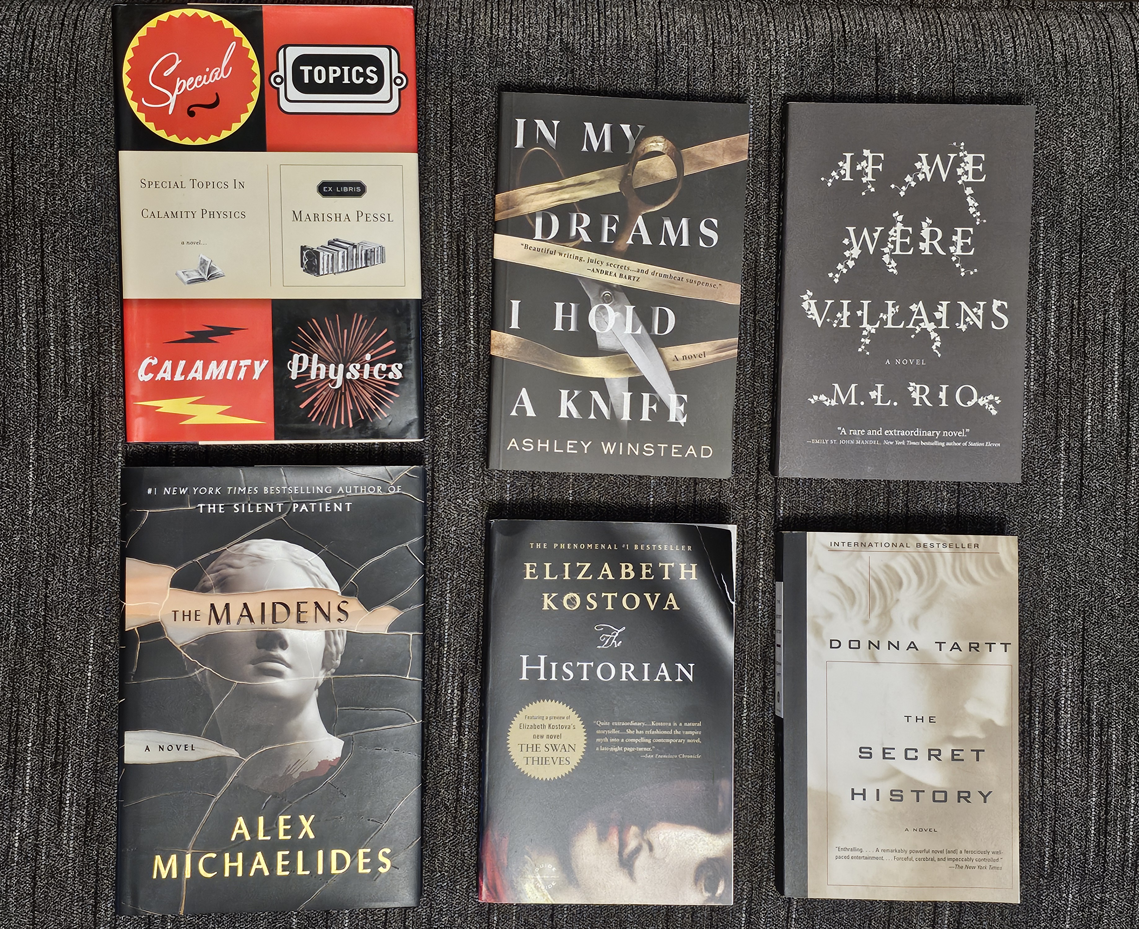 I picked up Special Topics in Calamity Physics by Marisha Pessl, In My Dreams I Hold a Knife by Ashley Winstead, If We Were Villains by M.L. Rio, The Maidens by Alex Michaelides, The Historian by Elizabeth Kostova, and The Secret History by Donna Tartt.
