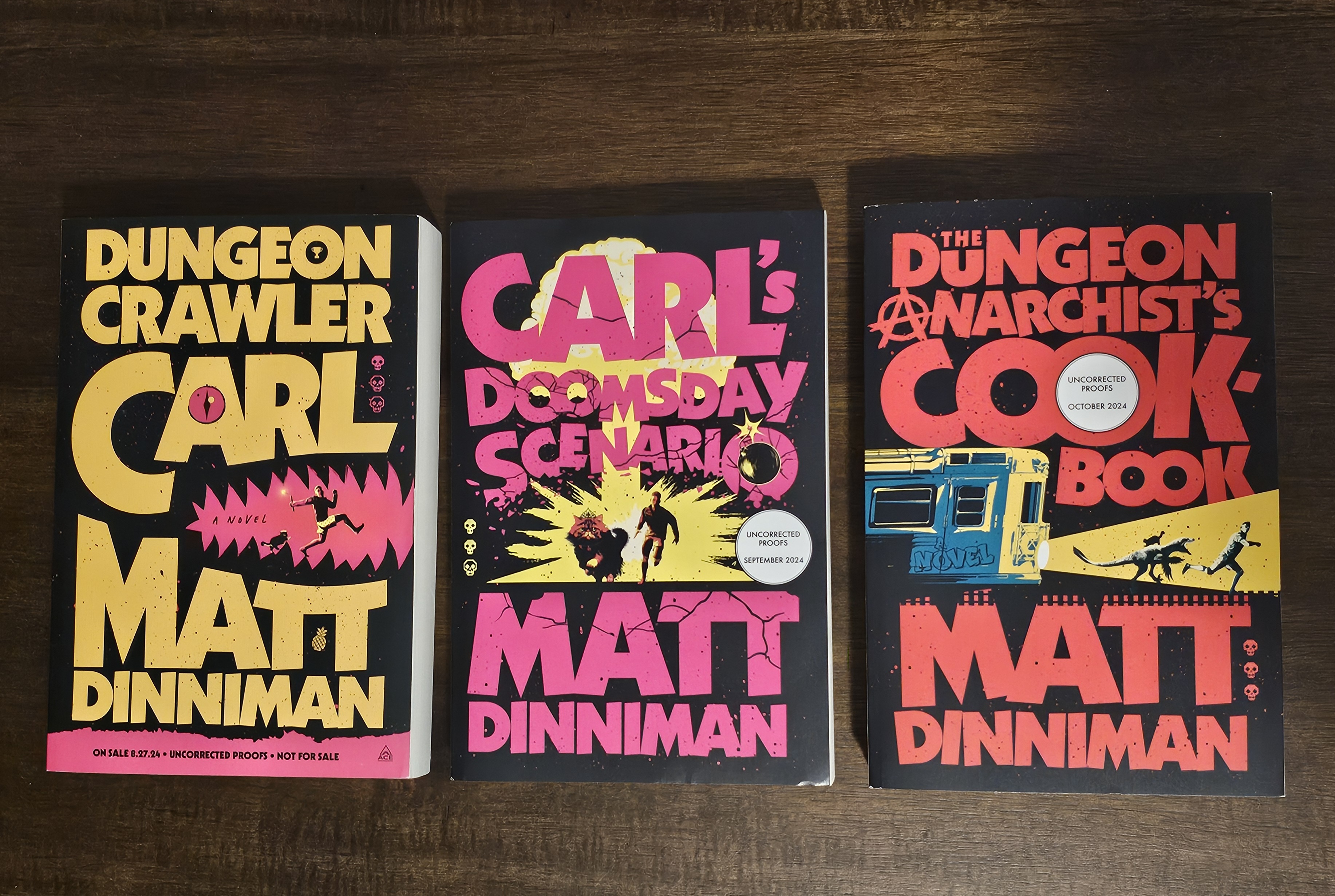 The wonderful folks at Ace were kind enough to send over physical ARCs of Dungeon Crawler Carl, Carl’s Doomsday Scenario, and The Dungeon Anarchist’s Cookbook by Matt Dinniman.