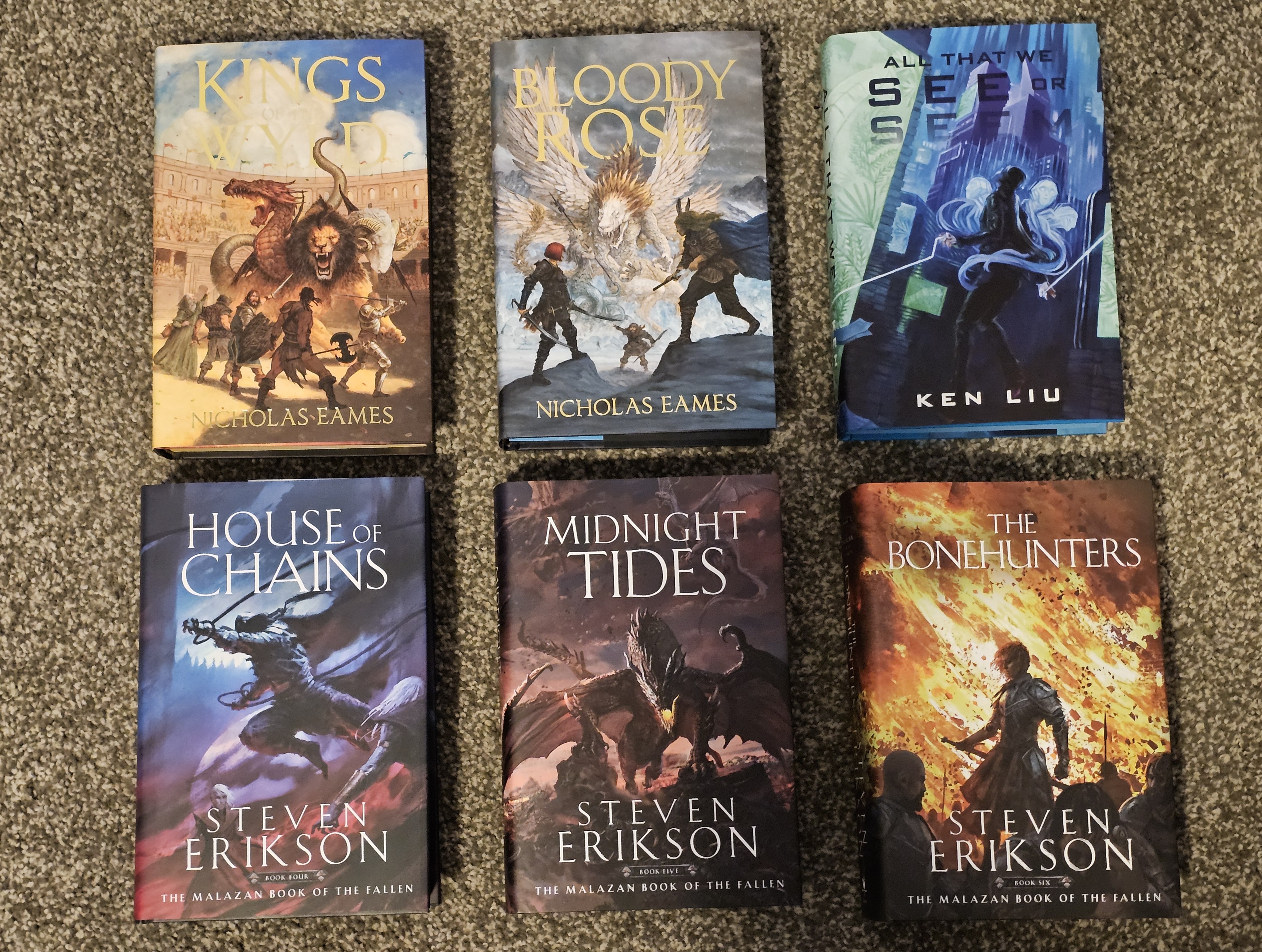 I have a whole pile of pretty editions from The Broken Binding that have accumulated since my last Stacking the Shelves post in October. We have Kings of the Wyld and Bloody Rose by Nicholas Eames, All That We See or Seem by Ken Liu, and House of Chains, Midnight Tides, and The Bonehunters by Steven Erikson. Each of these are really beautiful and of lovely quality.