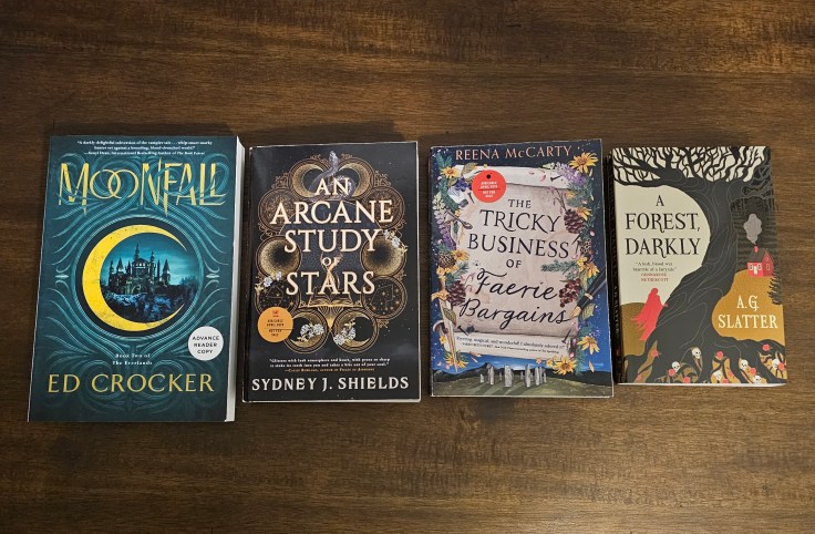 It’s been awhile since I’ve done a Stacking the Shelves post, so I have several physical books to share! I received ARCs of Moonfall by Ed Crocker, An Arcane Study of Stars by Sydney J. Shields, and The Tricky Business of Faerie Bargains by Reena McCarty and a finished copy of A Forest, Darkly by A.G. Slatter.